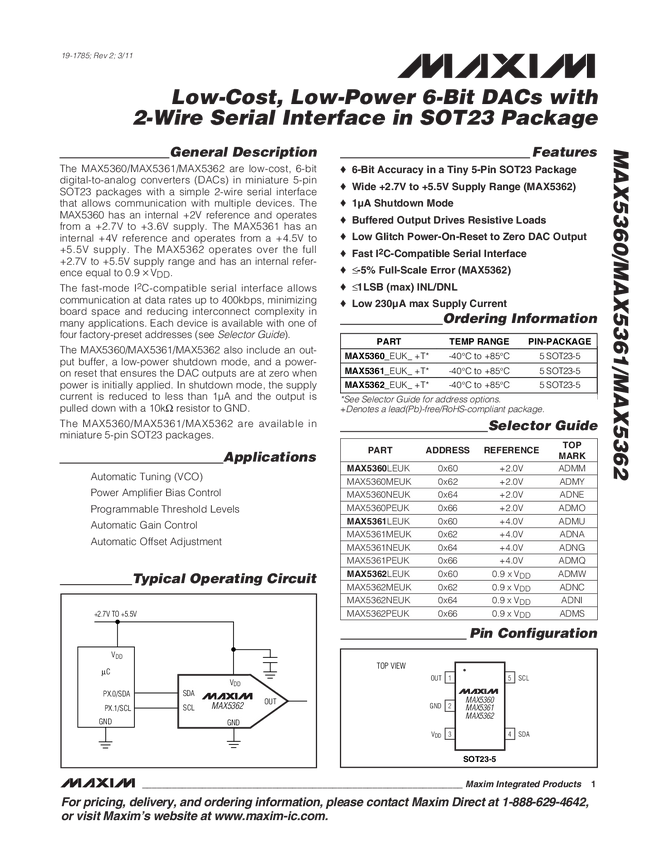 MAX5360 Low-Cost, Low-Power 6-Bit DACs with 2-Wire Serial Interface in SOT23 Packag...