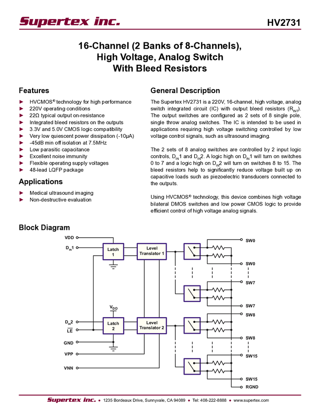 HV2731 16-ch (2 Banks of 8-chs), HV, Analog Switch /w Bleed Resistors