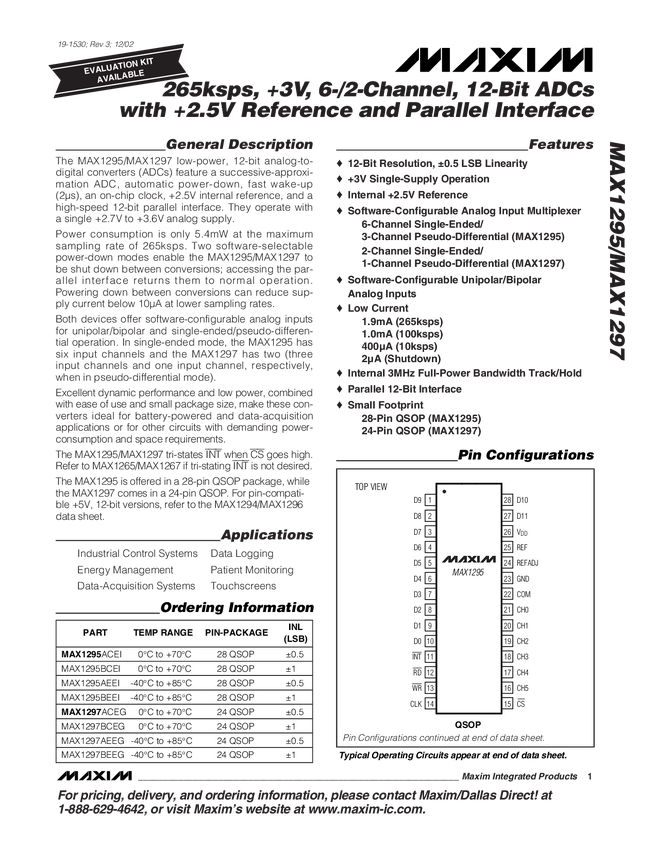 MAX1295 265ksps, +3V, 6-/2-Channel, 12-Bit ADCs with +2.5V Reference and Parallel I...