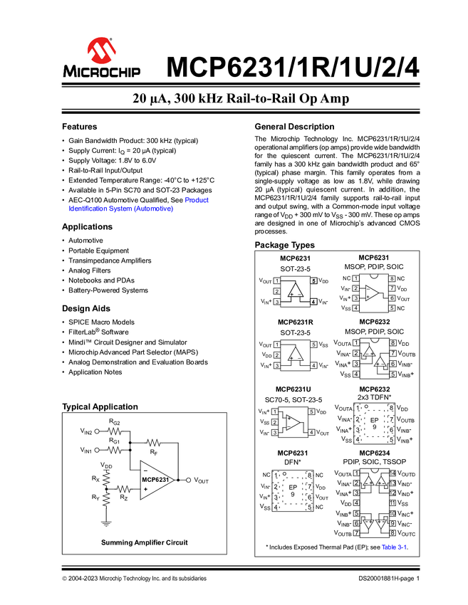 MCP6231/1R/1U/2/4 - 20 uA, 300 kHz Rail-to-Rail Op Amp Data Sheet