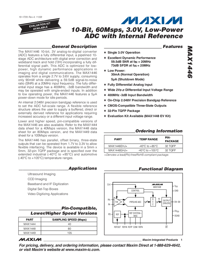 MAX1446 10-Bit, 60Msps, 3.0V, Low-Power ADC with Internal Reference