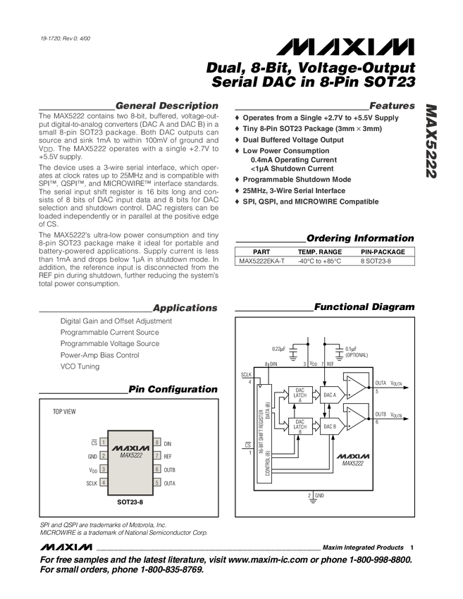 MAX5222 Dual, 8-Bit, Voltage-Output, Serial DAC in 8-Pin SOT23