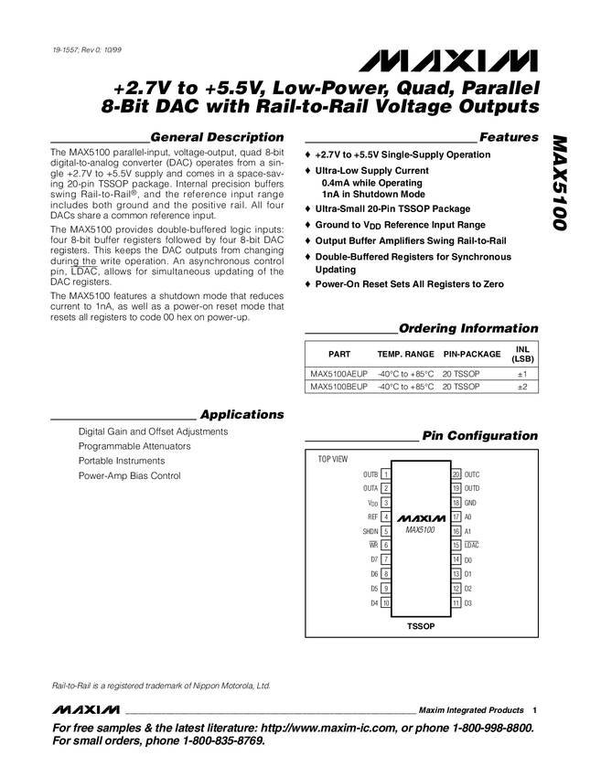 MAX5100 +2.7V to +5.5V, Low-Power, Quad, Parallel 8-Bit DAC with Rail-to-Rail Volta...