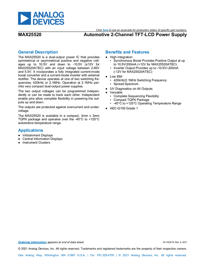 MAX25520 Automotive 2-Channel TFT-LCD Power Supply