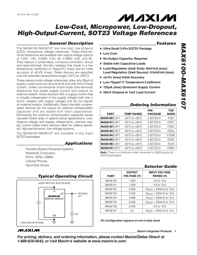 Low-Cost, Micropower, Low-Dropout, High-Output-Current, SOT23 Voltage References