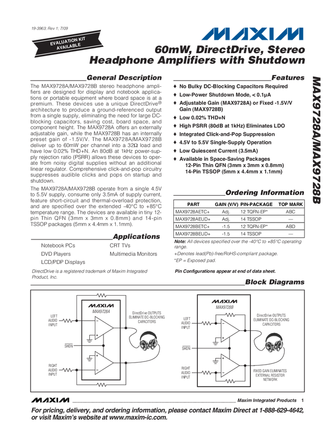 MAX9728A 60mW, DirectDrive, Stereo Headphone Amplifier with Shutdown