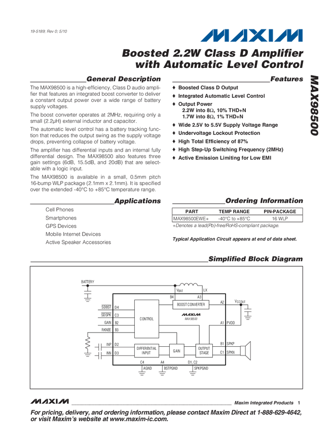 MAX98500 Boosted 2.2W Class D Amplifier with Automatic Level Control