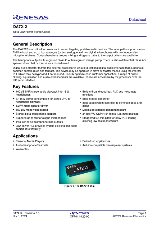 DA7212 Ultra-Low Power Stereo Codec with 650µW Always-On Power Mode
