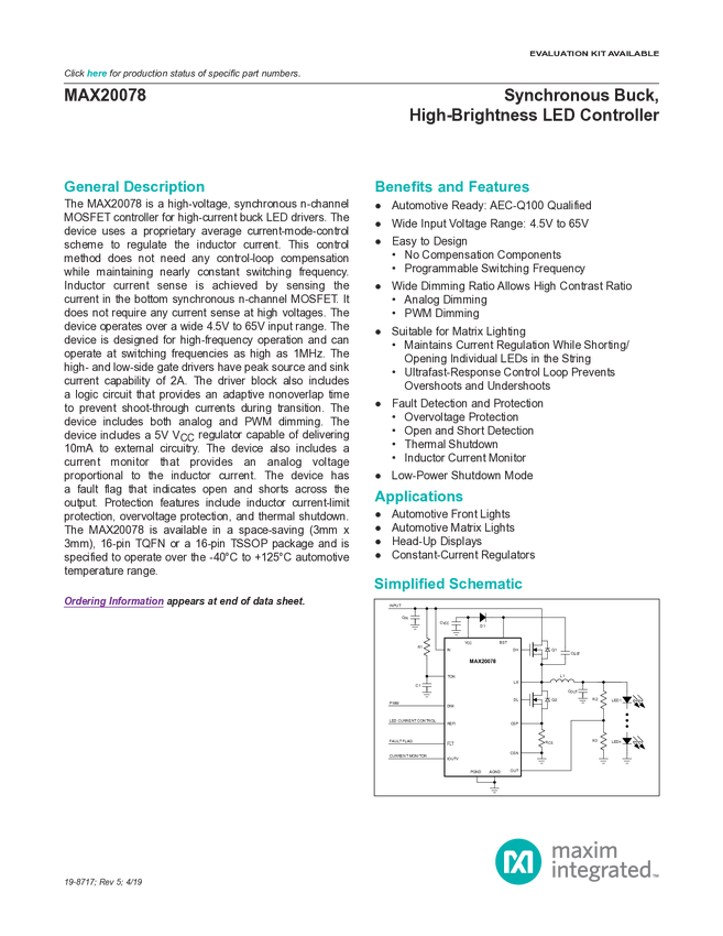 MAX20078 Synchronous Buck, High-Brightness LED Controller