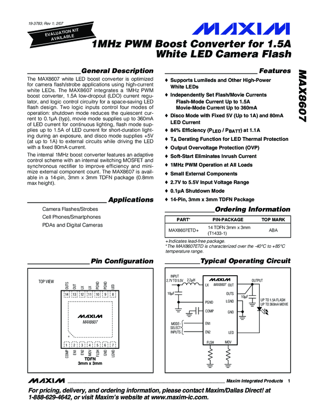 MAX8607 1MHz PWM Boost Converter for 1.5A White LED Camera Flash