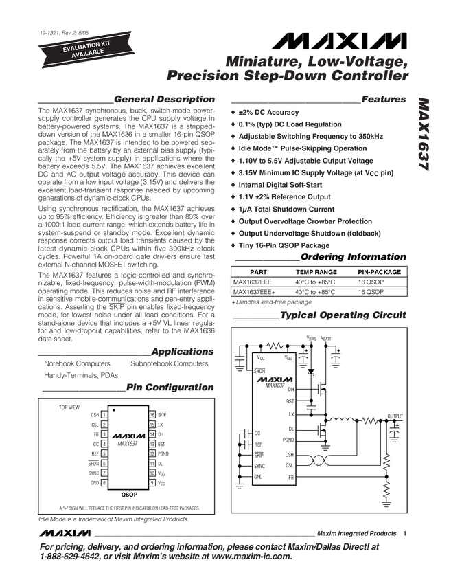 MAX1637 Miniature, Low-Voltage, Precision Step-Down Controller
