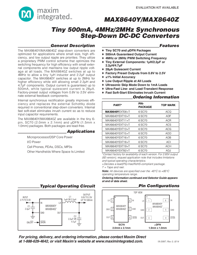 MAX8640Y Tiny 500mA, 4MHz/2MHz Synchronous Step-Down DC-DC Converters