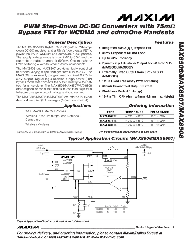 MAX8506 PWM Step-Down DC-DC Converters with 75mΩ Bypass FET for WCDMA and cdmaOne H...