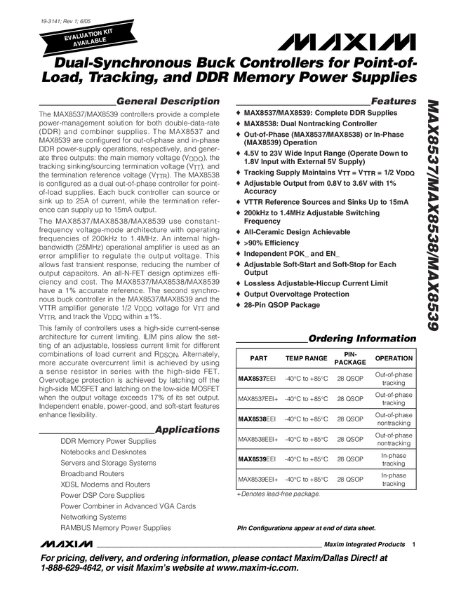MAX8539 Dual-Synchronous Buck Controllers for Point-of-Load, Tracking, and DDR Memo...