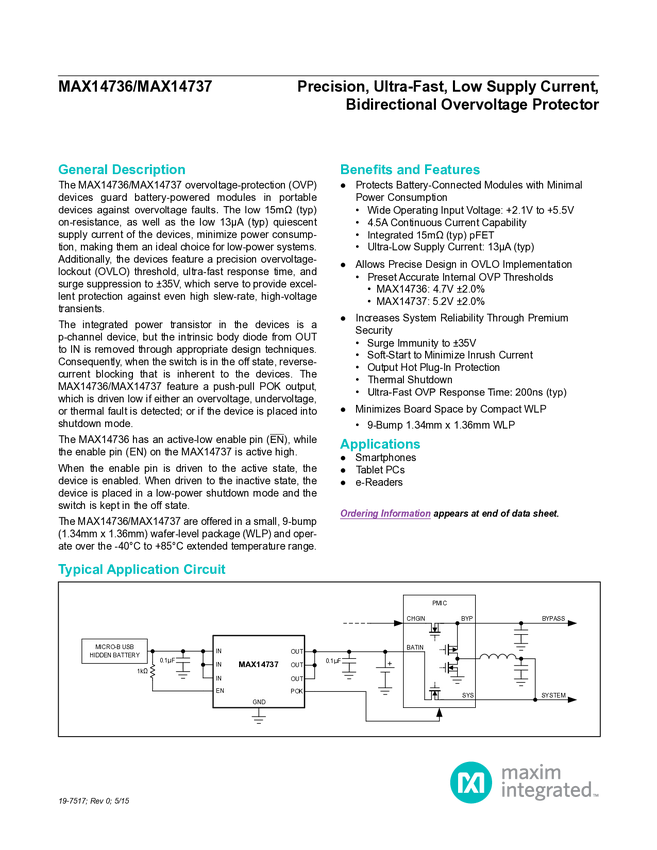 MAX14736 Precision, Ultra-Fast, Low Supply Current, Bidirectional Overvoltage Protec...