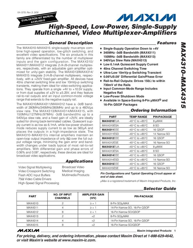 MAX4314 High-Speed, Low-Power, Single-Supply Multichannel, Video Multiplexer-Amplif...