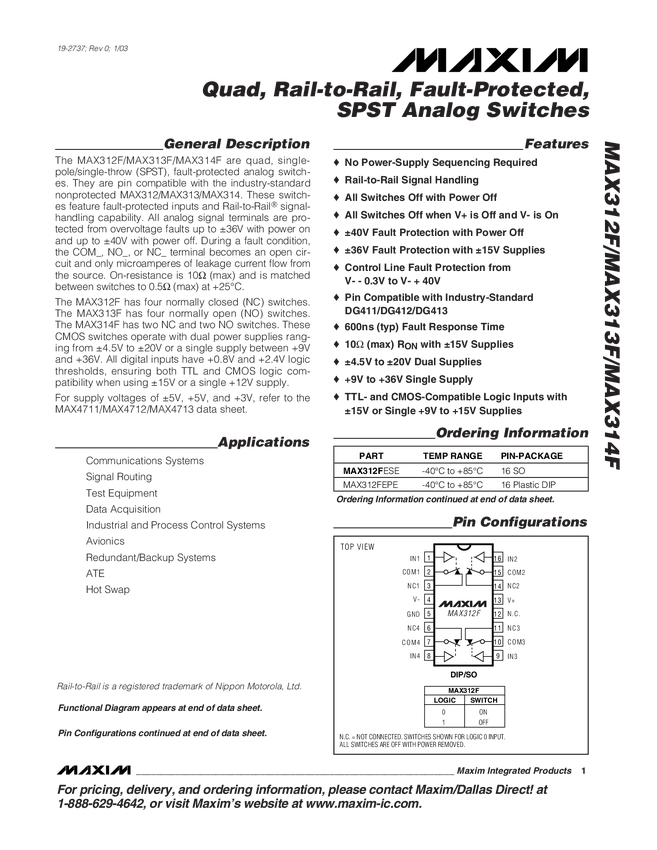 MAX312F Quad, Rail-to-Rail, Fault-Protected, SPST Analog Switches