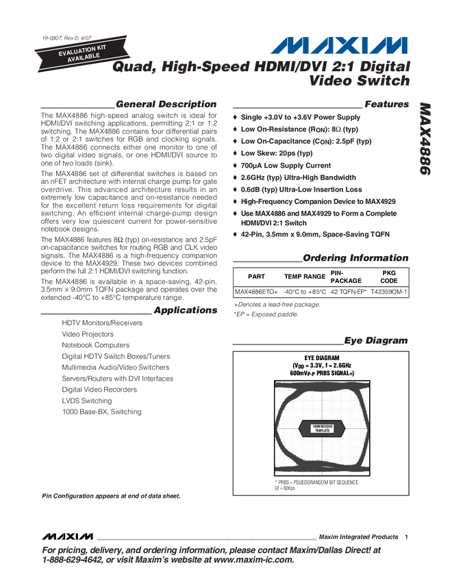MAX4886 Quad, High-Speed HDMI/DVI 2:1 Digital Video Switch