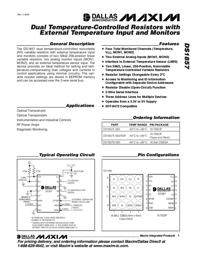 DS1857 Dual Temperature-Controlled Resistors with External Temperature Input and M...