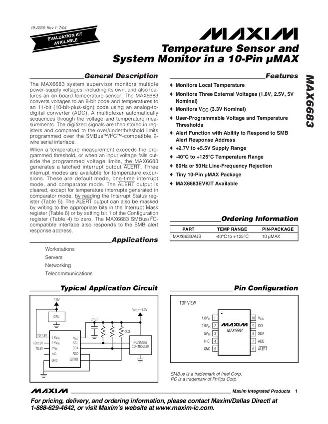 MAX6683 Temperature Sensor and System Monitor in a 10-Pin µMAX