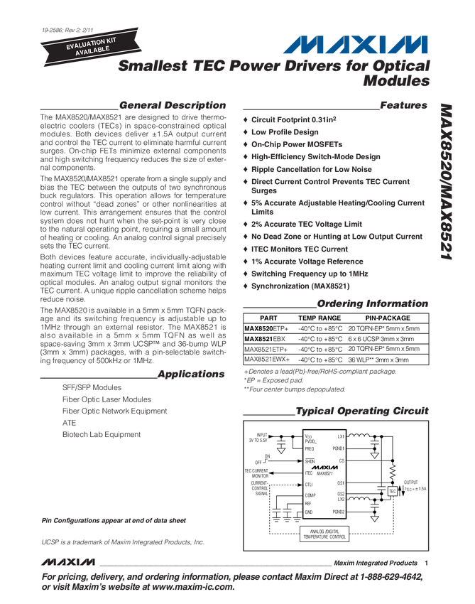 MAX8520 Smallest TEC Power Drivers for Optical Modules