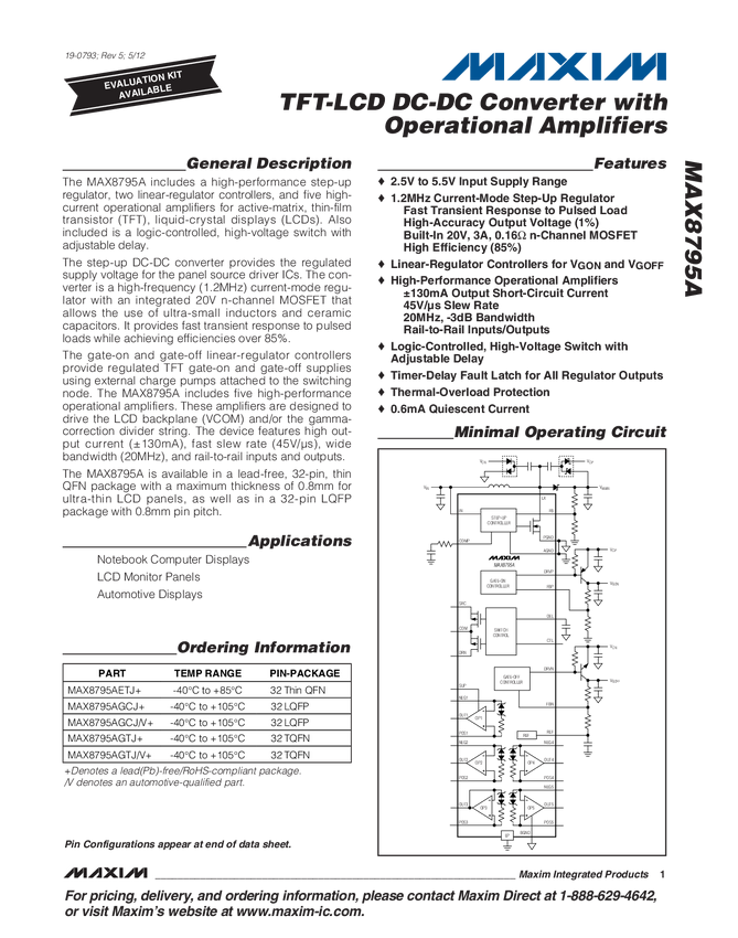 MAX8795A TFT-LCD DC-DC Converter with Operational Amplifiers