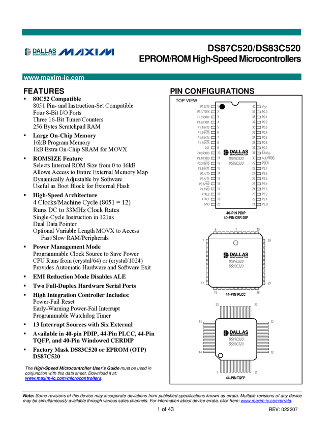DS87C520 EPROM/ROM High-Speed Microcontrollers