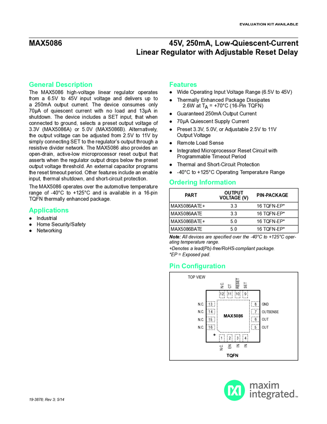 MAX5086A 45V, 250mA, Low-Quiescent-Current Linear Regulator with Adjustable Reset De...