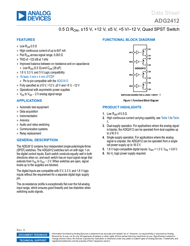 ADG2412 0.5 Ω R, ±15 V, +12 V, ±5 V, +5 V/–12 V, Quad SPST Switch
