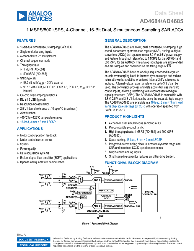 AD4684 1 MSPS, 4-Channel, 16-Bit Dual, Simultaneous Sampling SAR ADCs