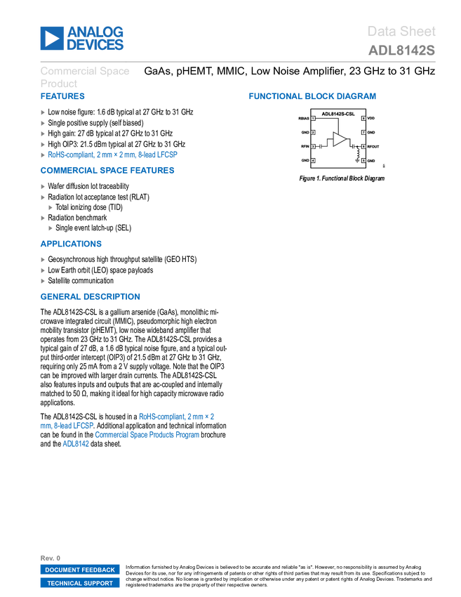 ADL8142S GaAs, pHEMT, MMIC, Low Noise Amplifier, 23 GHz to 31 GHz