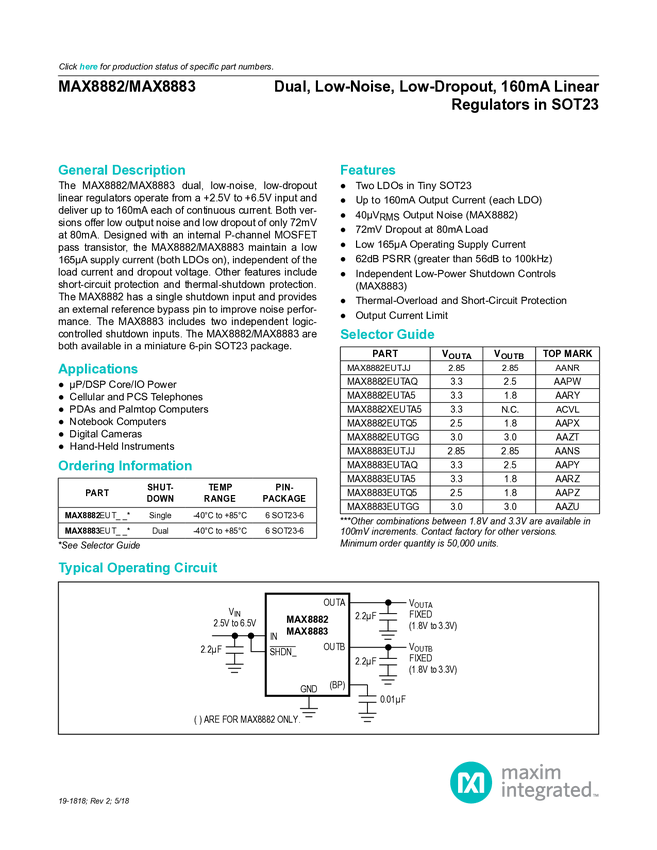 MAX8882 Dual, Low-Noise, Low-Dropout, 160mA Linear Regulators in SOT23