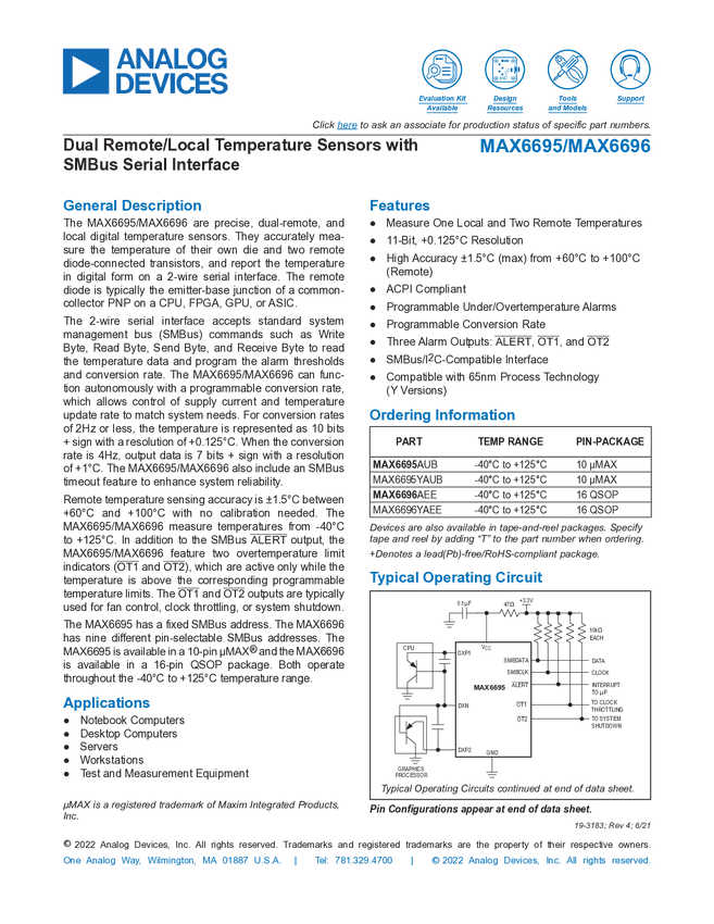 MAX6695 Dual Remote/Local Temperature Sensors with SMBus Serial Interface