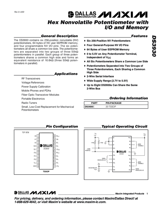 DS3930 Hex Nonvolatile Potentiometer with I/O and Memory