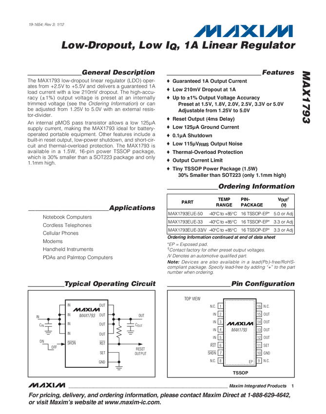 MAX1793 Low-Dropout, Low-I, 1A Linear Regulator