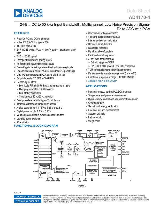 AD4170-4 24-Bit, DC to 50 kHz Input Bandwidth, Multichannel, Low Noise Precision Sig...