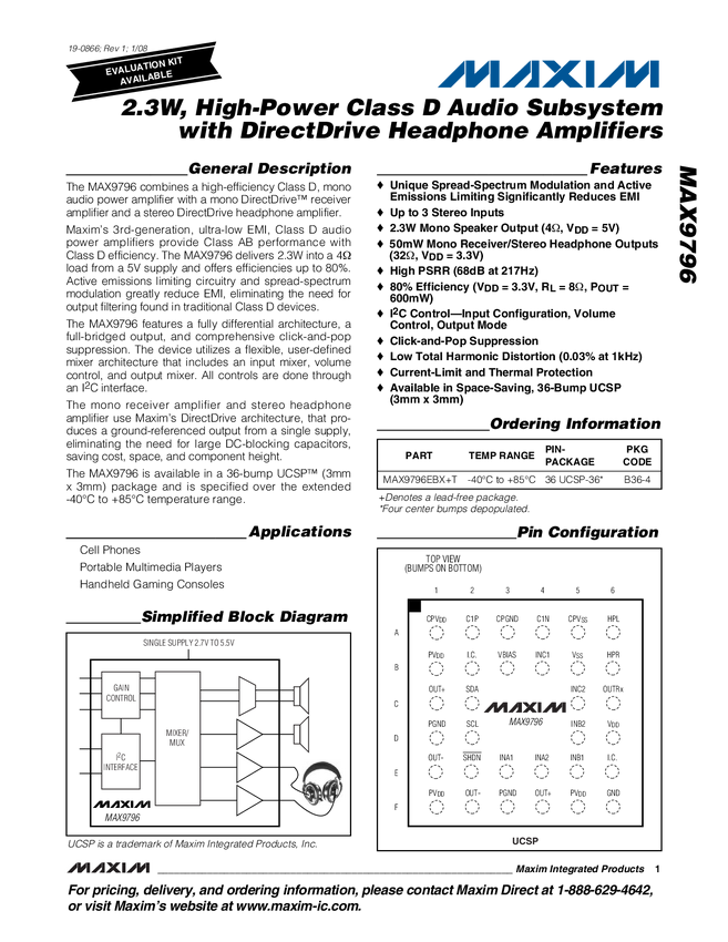 MAX9796 2.3W, High-Power Class D Audio Subsystem with DirectDrive Headphone Amplifi...