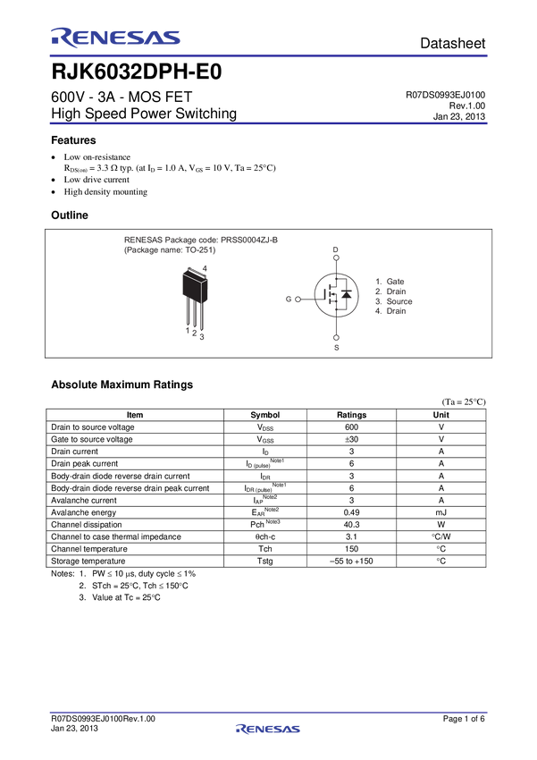 RJK6032DPH-E0 Nch Single Power Mosfet 600V 2A 3700Mohm To-251