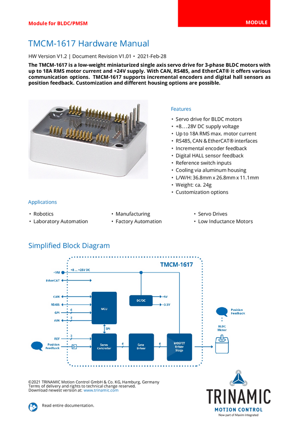 TMCM-1617 Low-weight miniaturized servo drive for 3-phase BLDC motors 8 to 28V, 18A,...