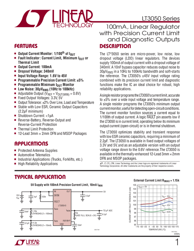 LT3050 100mA, Linear Regulator with Precision Current Limit and Diagnostic Outputs
