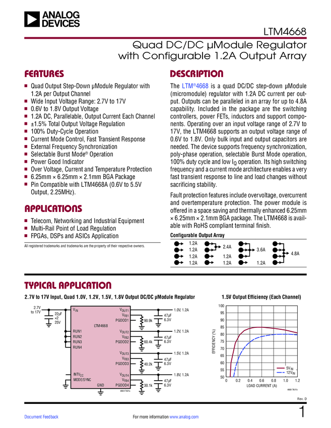 LTM4668 Quad DC/DC µModule Regulator with Configurable 1.2A Output Array