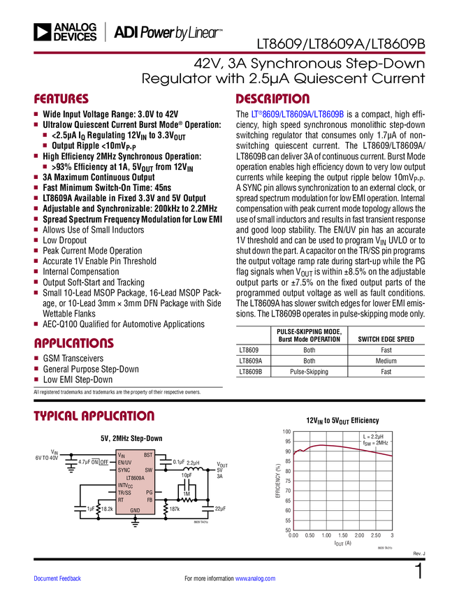 LT8609 LT8609A LT8609B 42V, 3A Synchronous Step-Down Regulator with 2.5µA Quiescent Current