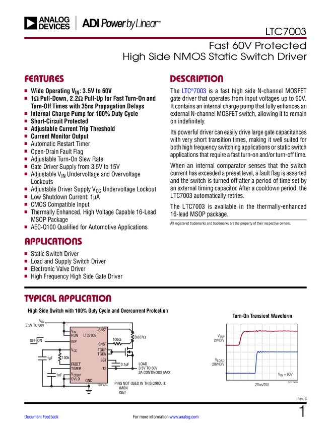 LTC7003 Fast 60V Protected High Side NMOS Static Switch Driver