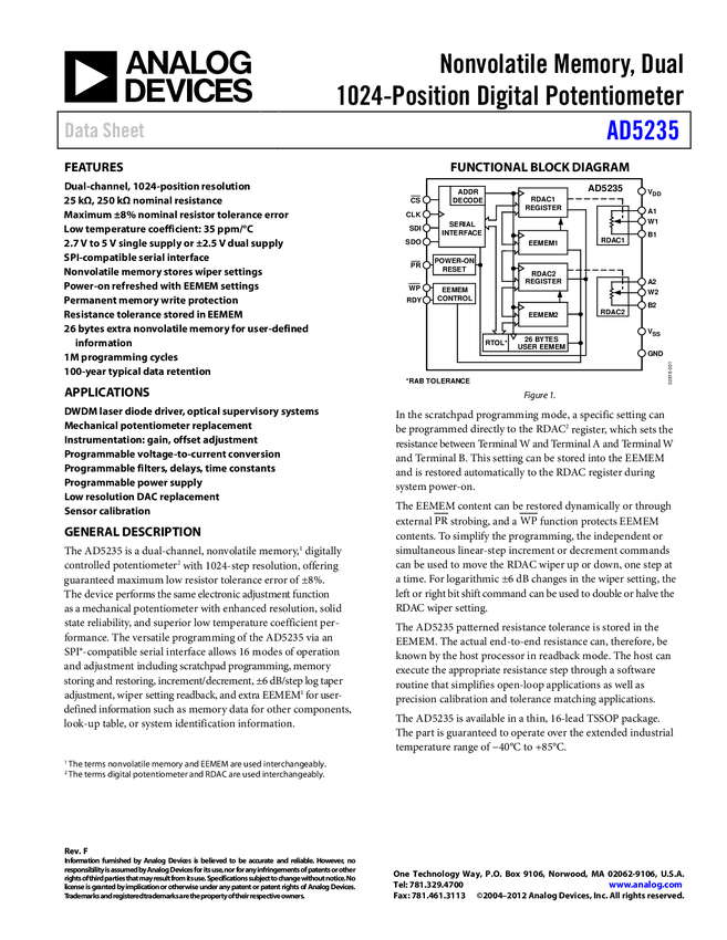 AD5235 Nonvolatile Memory, Dual 1024-Position Digital Potentiometer