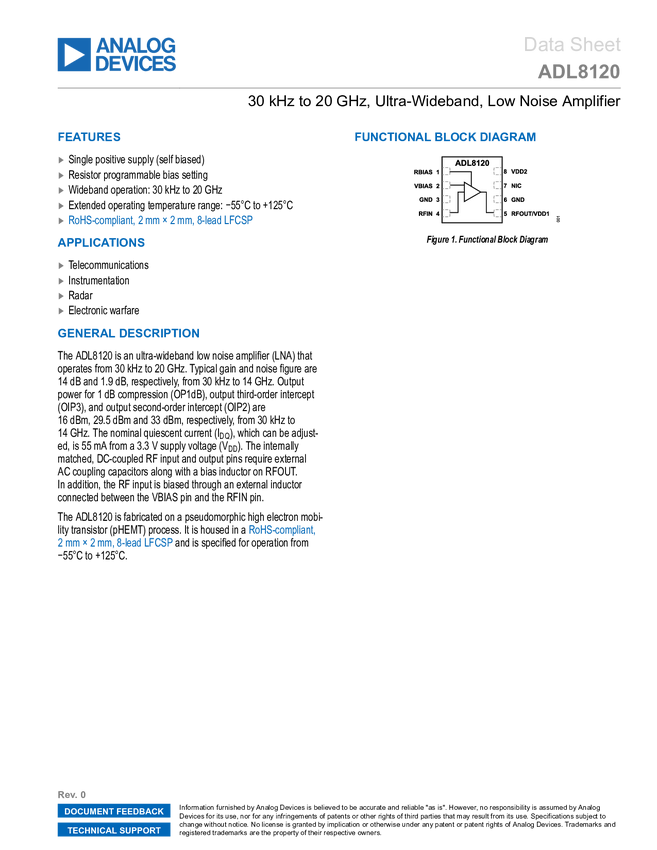 ADL8120 30 kHz to 20 GHz, Ultra-Wideband, Low Noise Amplifier