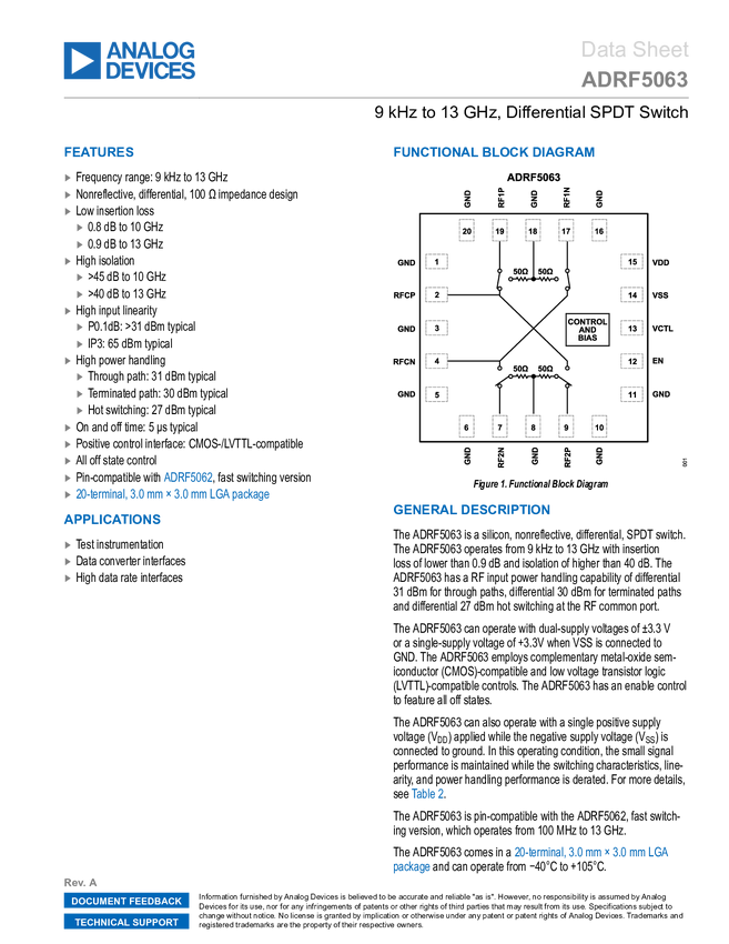 ADRF5063 9 kHz to 13 GHz, Differential SPDT Switch
