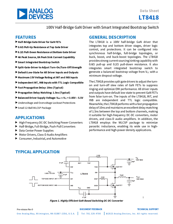 LT8418 100V Half-Bridge GaN Driver with Smart Integrated Bootstrap Switch