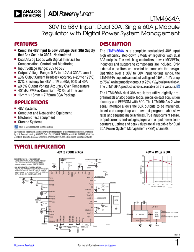 LTM4664A 30V to 58V Input, Dual 30A, Single 60A μModule Regulator with Digital Power...
