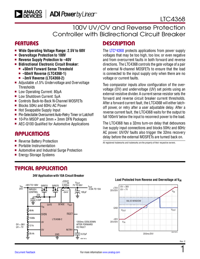 LTC4368 100V UV/OV and Reverse Protection Controller with Bidirectional Circuit Bre...