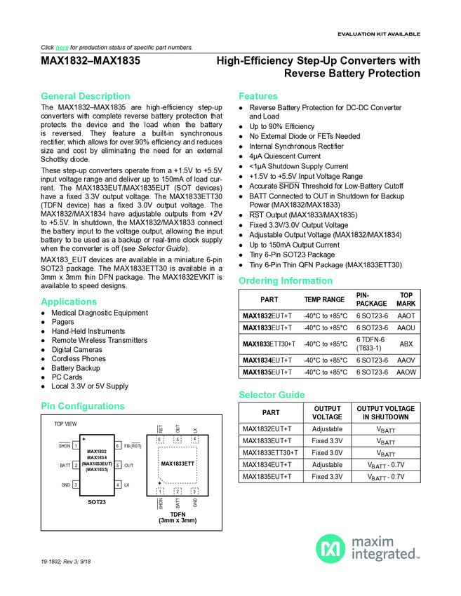 MAX1832 High-Efficiency Step-Up Converters with Reverse Battery Protection